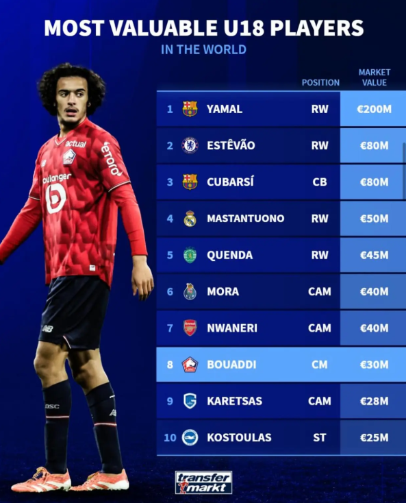 Transfermarkt has compiled a list of the 10 most valuable players currently under the age of 18. Details are as follows: